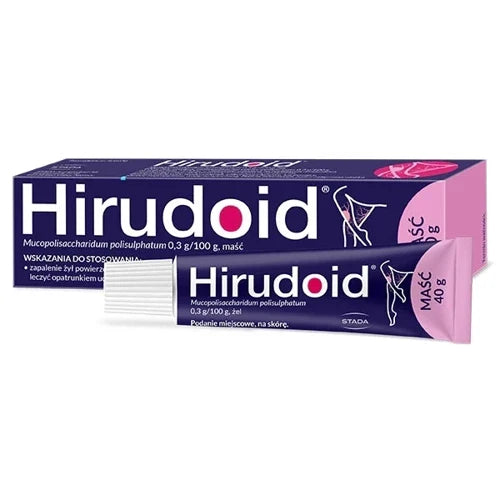 Action Hirudoid: The product Hirudoid prevents the formation of blood clots superficial, stimulates their absorption and exhibits a local effect anti-inflammatory, and it accelerates the absorption of edema and hematoma. Polyphenyl mukopolisacharydowy runs through anticoagulant effect on coagulation and fibrinolytic system. Furthermore, it exerts anti-inflammatory action by inhibiting the activity of catabolic enzymes and prostaglandin synthesis and affecting the complement system. It also causes the regeneration of connective tissue activating the synthesis of mesenchymal cells and normalization of water binding intercellular substance. After topical application of the preparation active substances penetrate into the tissues located under the surface of the skin, exerting a therapeutic effect.