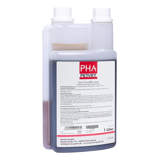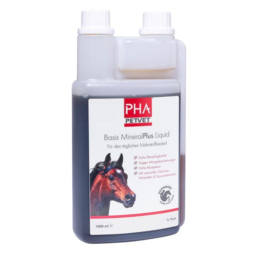 PHA Basis MineralPlus Liquid ensures a balanced supply of minerals, trace elements and vitamins when fed regularly and thus prevents deficiency symptoms. As part of initial treatment, it balances out the imbalance between calcium and phosphorus that is often present in basic feed. In this way, it has a positive effect on hoof quality, skin condition, performance and muscle metabolism.