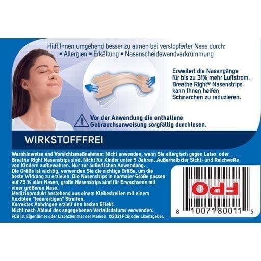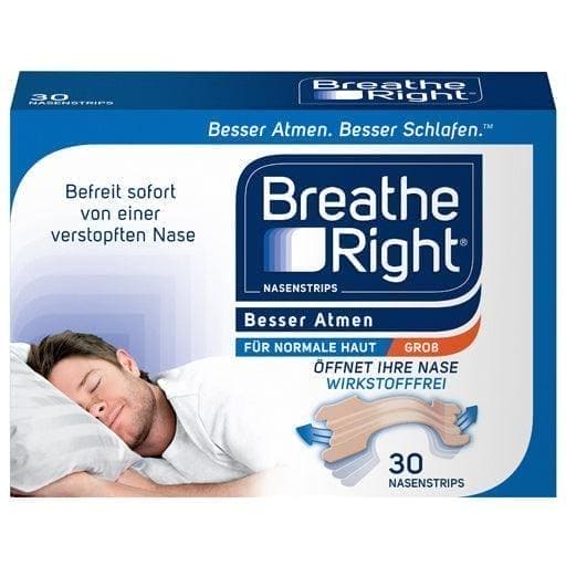 Better breathing Breathe Right nasal strips, also known as nasal plasters, lift the nostrils and can thus provide immediate relief for problems with nasal breathing. They open your nose from the outside, help you with a blocked nose, for example due to a cold or allergies / hay fever and can reduce snoring and be an alternative to nasal sprays with a decongestant effect. Better Atmen nose strips also make breathing easier during sports, physical exertion and wearing a respirator mask.