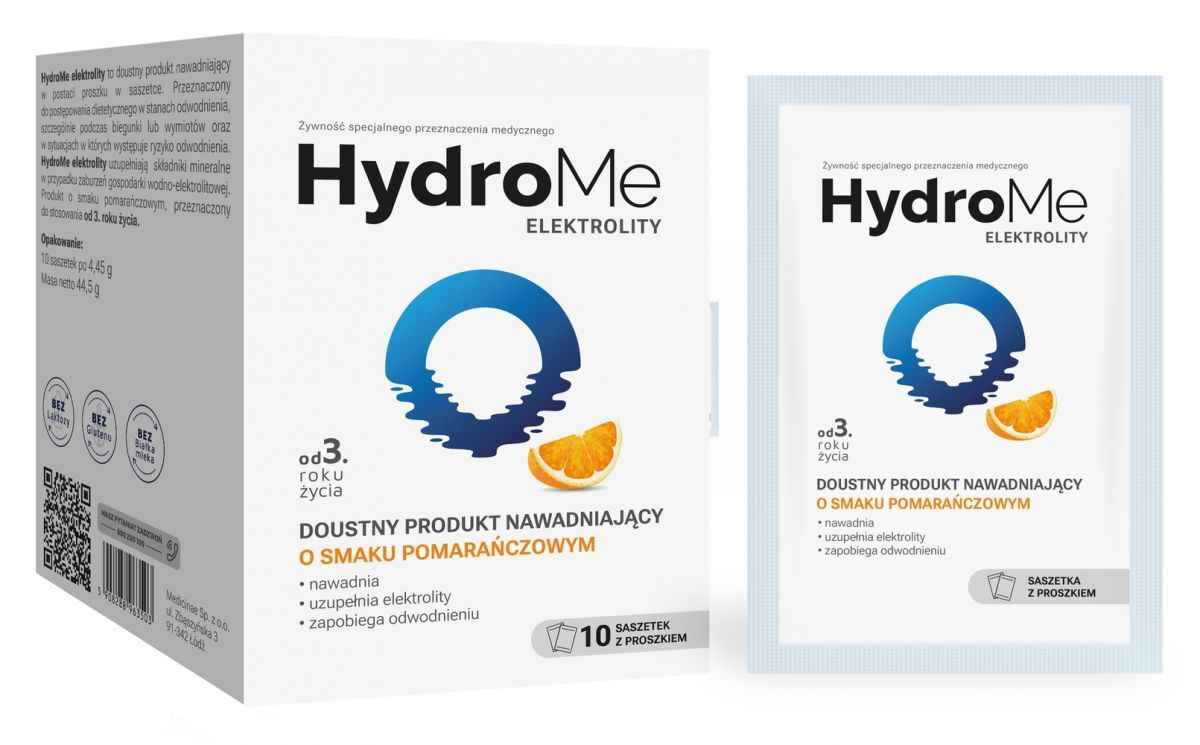 Electrolytes is an oral rehydration product in the form of an orange-flavored powder. The contents of the sachet should be dissolved in 200 ml of water before administration. This product is intended for dietary management of dehydration, especially during diarrhea, vomiting, and in situations where there is a risk of dehydration. HydroMe Electrolytes supplement minerals in cases of water and electrolyte imbalance. Suitable for ages 3 and up.
