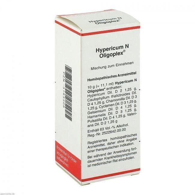 10 g (= 11.1 ml) Hypericum N Oligoplex contain: Medicinally active ingredients: Hypericum Dil. D 2 1.25 g, Caulophyllum thalictroides Dil. D 4 1.25g, Chamomilla dil. D 3 1.25 g, cyclamen dil. D 3 1.25 g, Gelsemium dil. D 4 1.25 g, witch hazel dil. D 3 1.25g, Pulsatilla dil. D 4 1.25 g, Valeriana dil. D 2 1.25 g, 1 ml corresponds to 22 drops.
