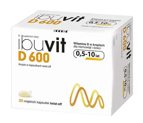 Ibuvit D 600 is among the group of dietary foods for special medical purposes. It is responsible for the addition of vitamin D in the body.This component contributes to the absorption of calcium from the digestive tract. Works also regulate the calcium-phosphate. As a result, it participates in the normal process of mineralization and formation of bone and teeth. In addition, a beneficial effect on the muscles and the functioning of the immune system. Children breastfed normally receive inadequate amounts of vitamin D, which is why it is recommended supplementation of this nutrient. Ibuvit D 600 is in the form of capsules twist-off.