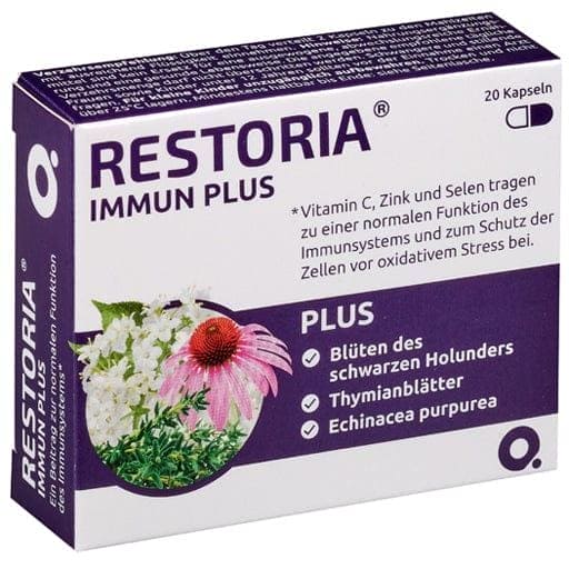 RESTORIA IMMUN PLUS, consisting of vital substances and plant extracts, is ideal for anyone who wants to support their body in fighting off infections. The vital substances vitamin C, selenium and zinc contribute to the normal functioning of the immune system and protect the cells from oxidative stress. The plant extracts from black elder flowers, Echinacea purpurea root and thyme leaves have long been known for their valuable, typical properties.