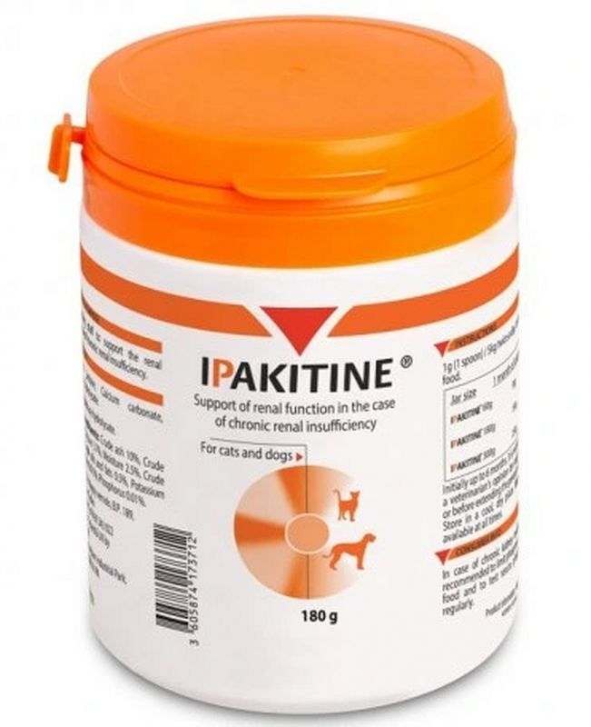 Ipakitine is a powdered preparation for mixing with food. Ipakitine is used in cats and dogs with chronic renal failure. Calcium carbonate helps to bind, and consequently, limit the absorption of phosphates contained in meat food. The addition of chitosan binds and removes uremic toxins from the body of the sick animal. Thanks to the balanced balance of phosphates, Ipakitine has a positive effect on the functioning of the kidneys.