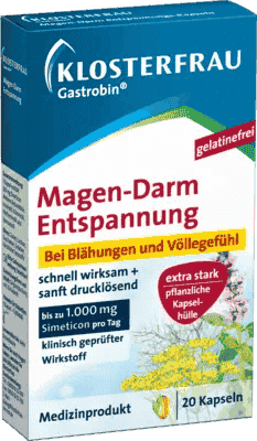 Mandatory text: 1. What are Klosterfrau Gastrobin® Gastrointestinal Relaxation Capsules and how do they work?Klosterfrau Gastrobin® Gastrointestinal Relaxation Capsules are a medical device that contains Simethicone. This is a substance that only works in the gastrointestinal tract and has a so-called defoaming and thus deflating effect. The Klosterfrau Gastrobin® gastrointestinal relaxation capsules are used for the symptomatic treatment of gas-related gastrointestinal complaints such as flatulence, a feeling of fullness and symptomatic dyspepsia. Composition: 1 capsule contains: 250 mg Simethicone Other ingredients: fennel oil, cumin oil, peppermint oil and star anise oil Without: gluten, lactose, sucrose, artificial colors, gelatin Note for diabetics: 1 capsule contains 94.9 mg carbohydrates corresponding to 1.33 kJ or 0.32 kcal (0.0046 BE). 2. What do you have to consider before taking Klosterfrau Gastrobin® Gastrointestinal Relaxation Capsules?The medical device must not be taken if you are allergic to Simethicone or any other ingredient. If you are not sure, please discuss this with your doctor before taking it. pregnancy and breast feeding period The medical device can be used during pregnancy and breastfeeding, as the active ingredient simethicone cannot be absorbed by the body. However, it is generally advisable to consult the doctor. What should be considered when taking other preparations? Interactions of Simethicon are not yet known. 3. How should you take the Klosterfrau Gastrobin® Gastrointestinal Relaxation Capsules?Due to its dosage of 250 mg Simethicone, the medical product is only intended for adults and can be taken up to a maximum dosage of 4 x 1 capsule daily before meals. The medical device is intended for short-term use and should not be taken for more than 30 days in a row. If you need the product for a longer period of time, please consult your doctor. 4. What should you do if you have used too large amounts of Klosterfrau Gastrobin Gastrointestinal Relaxation Capsules?Simeticon has a purely physical effect and is therefore practically not absorbed by the body. However, please follow the instructions in the dosage recommendation when taking it. 5. Side Effectsare not yet known for this medical product. If you notice any side effects, please inform your doctor immediately. Simeticon has a purely physical effect and is not absorbed in the gastrointestinal tract. Therefore, no side effects are to be expected even when taking larger amounts of Simethicone. Please keep the medical device out of the reach of children and do not use this preparation after the expiration date. The Klosterfrau Gastrobin® Gastrointestinal Relaxation Capsules should be stored dry and not above 25°C. They are available in packs of 20 capsules. A Klosterfrau Gastrobin® Gastrointestinal Relaxation Capsule contains 250 mg Simethicone and vegetable oils. Please keep the medical device out of the reach of children! |