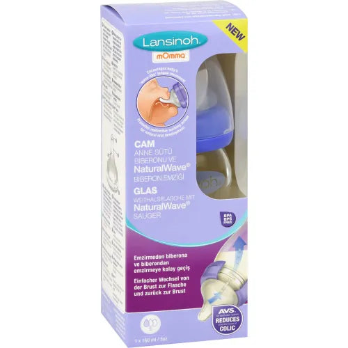 Our glass baby bottle with NaturalWave teat is compatible with all Lansinoh breast pumps and is available in two sizes: 160 ml and 240 ml. The small baby bottle (160 ml) is equipped with a NaturalWave teat size S, the large baby bottle (240 ml) contains a teat size M.