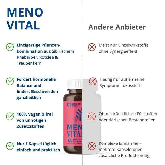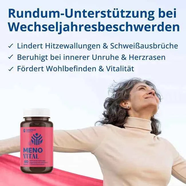 Botanical Health Meno Vital is a high-quality nutritional supplement specifically designed for women going through menopause. Its combination of valuable plant extracts and essential nutrients supports general well-being during this special phase of life.