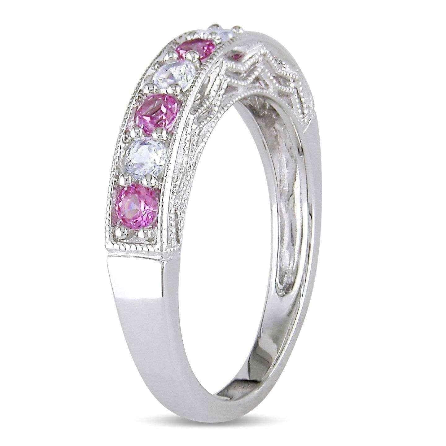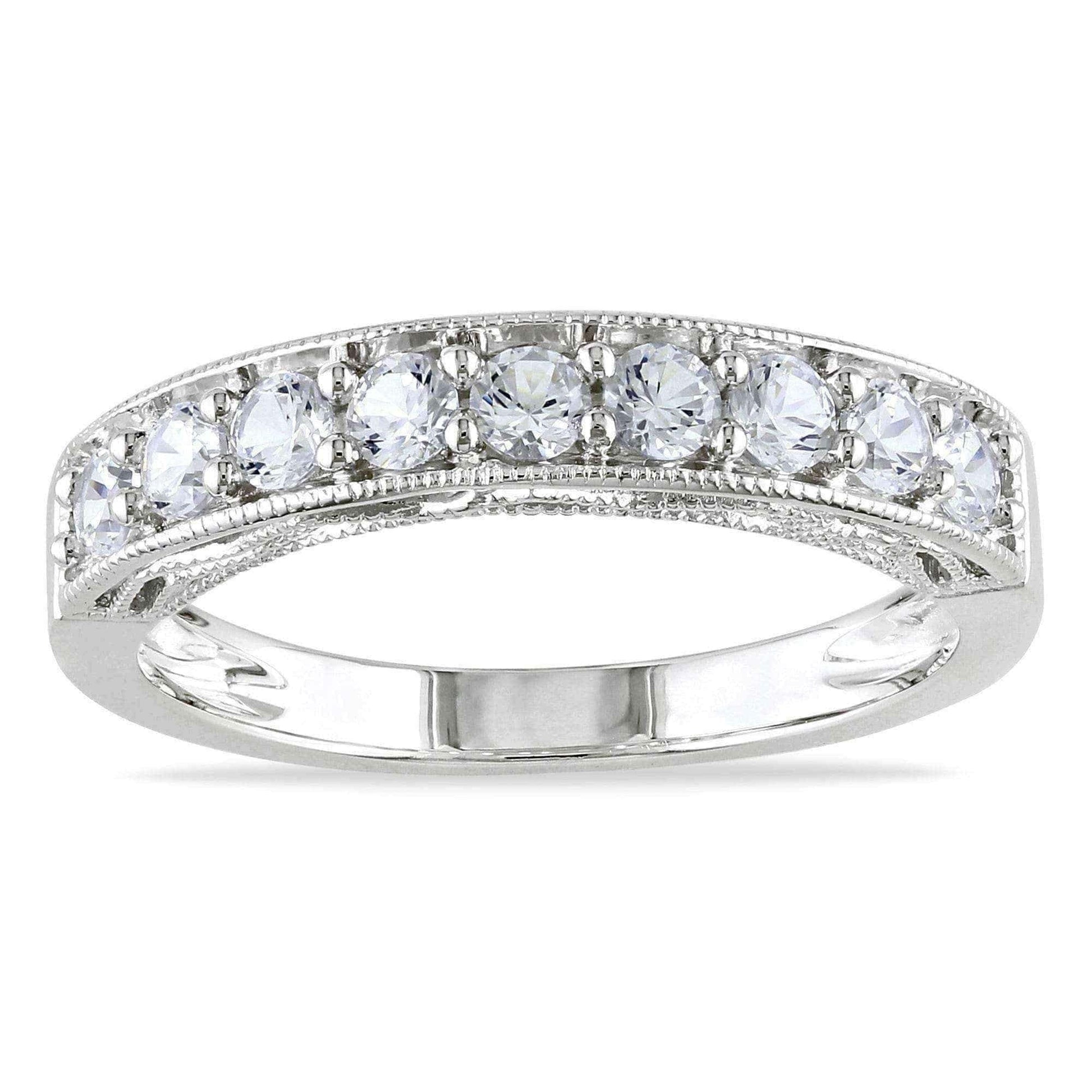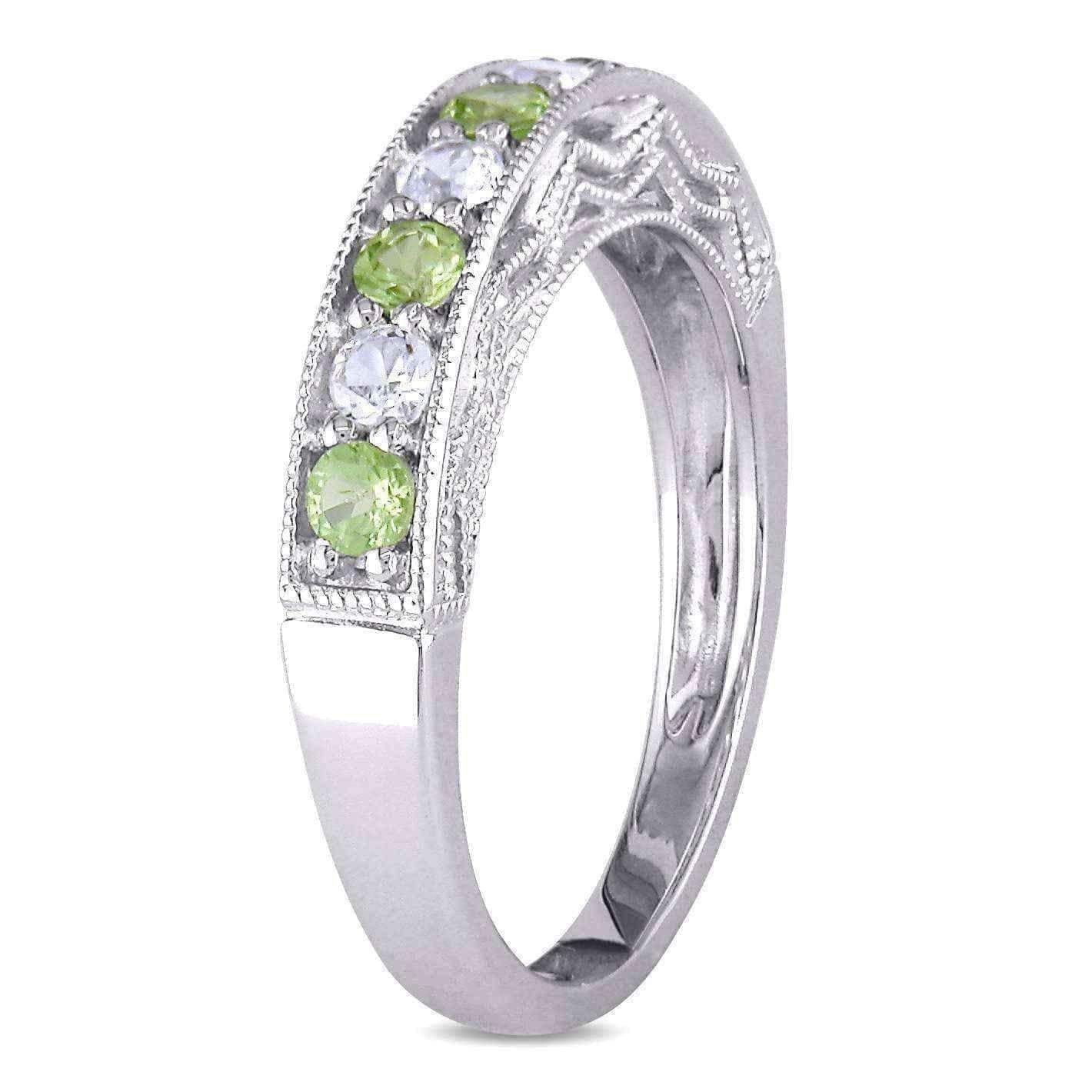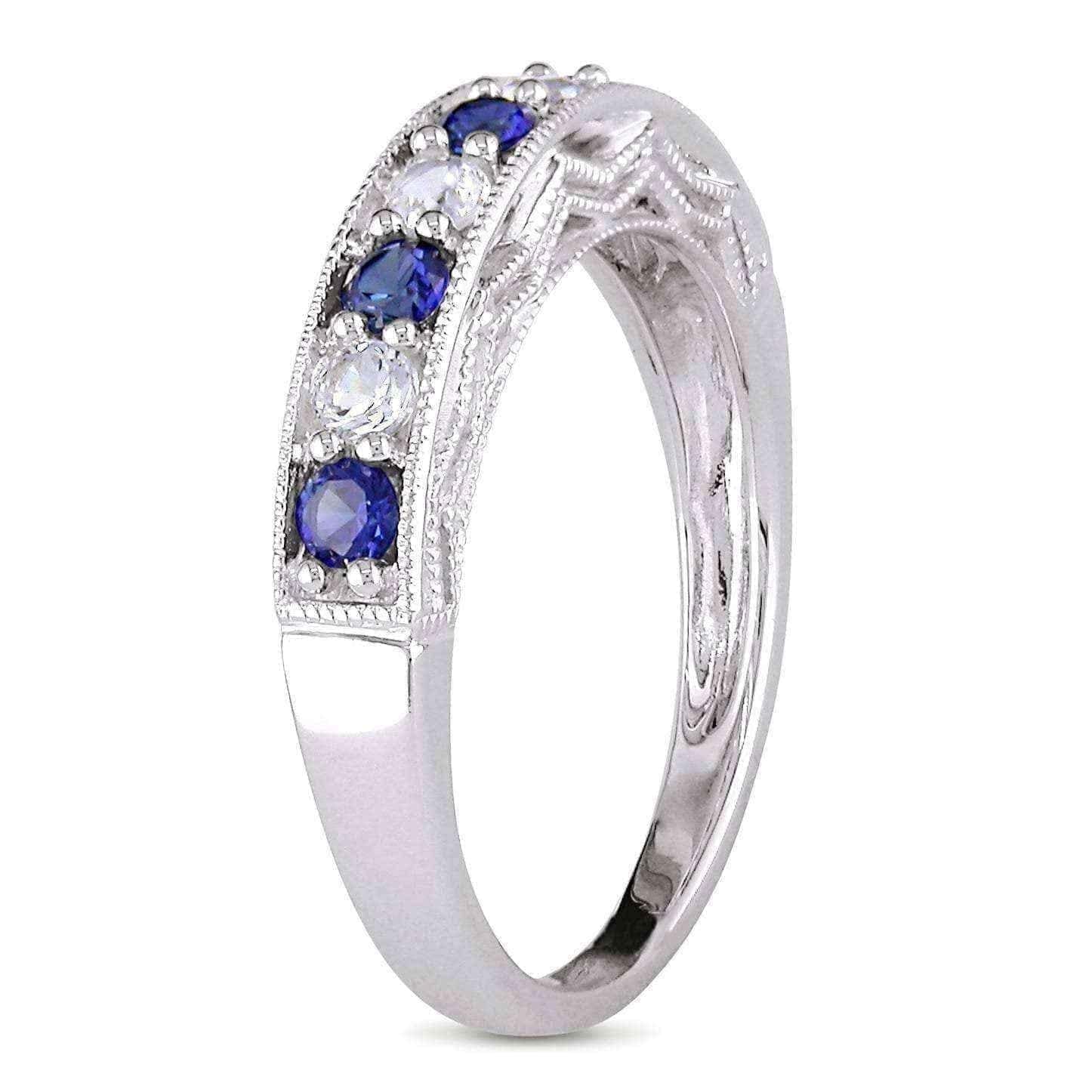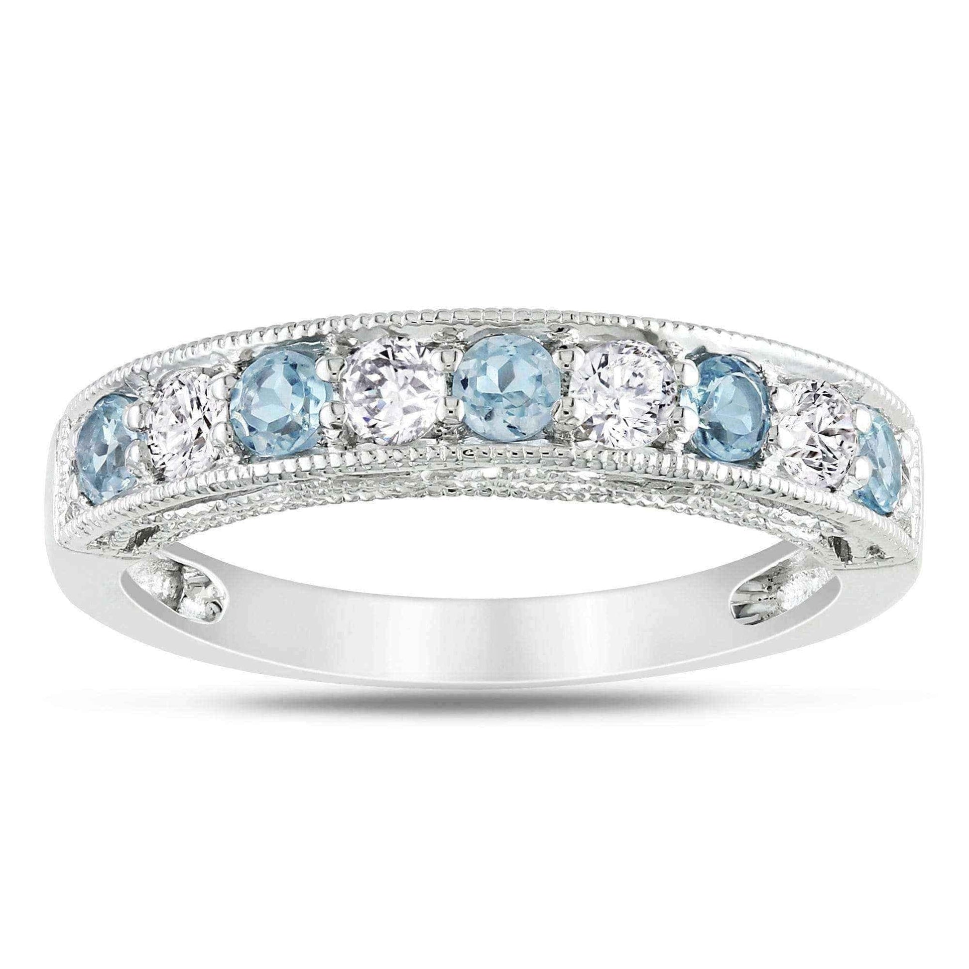 Showcase your style with the sparkling allure of this white sapphire and gemstone stackable anniversary band. Four round white sapphires are interspersed between your choice of brightly colored gemstones for a noticeable look. This band is slightly raised to show off stunning milgrain detailing along the edges and sides, giving the sterling silver a classic appeal.