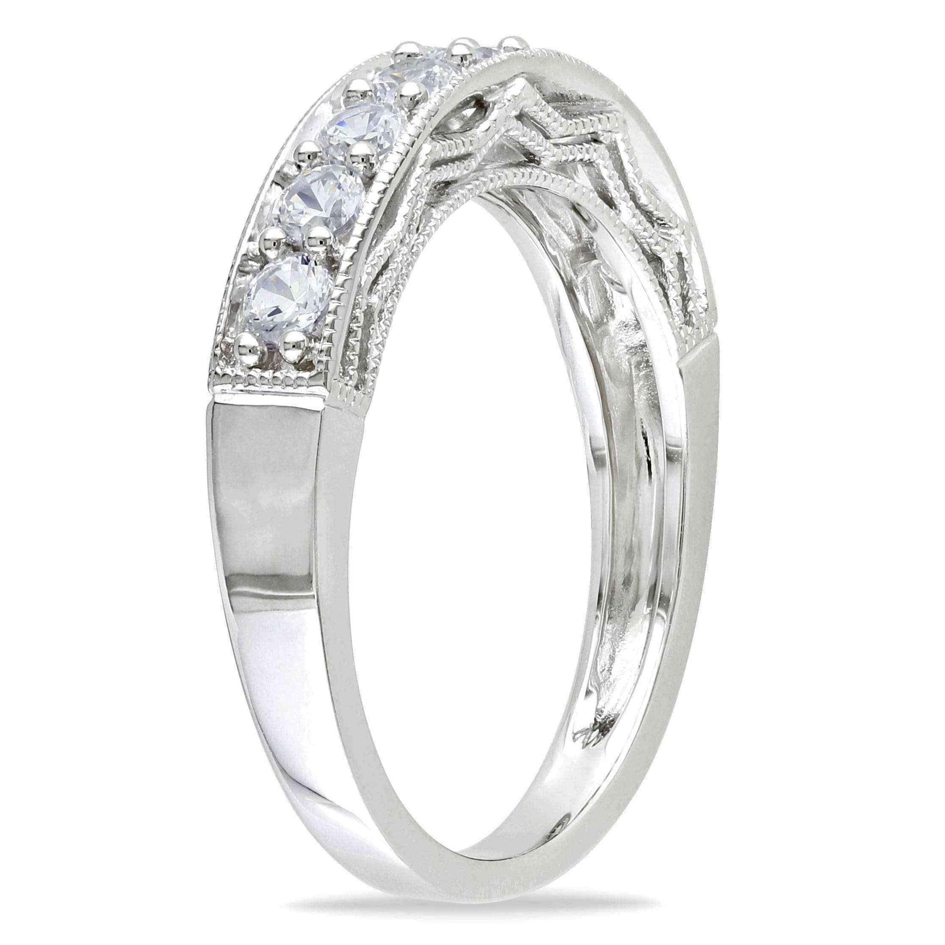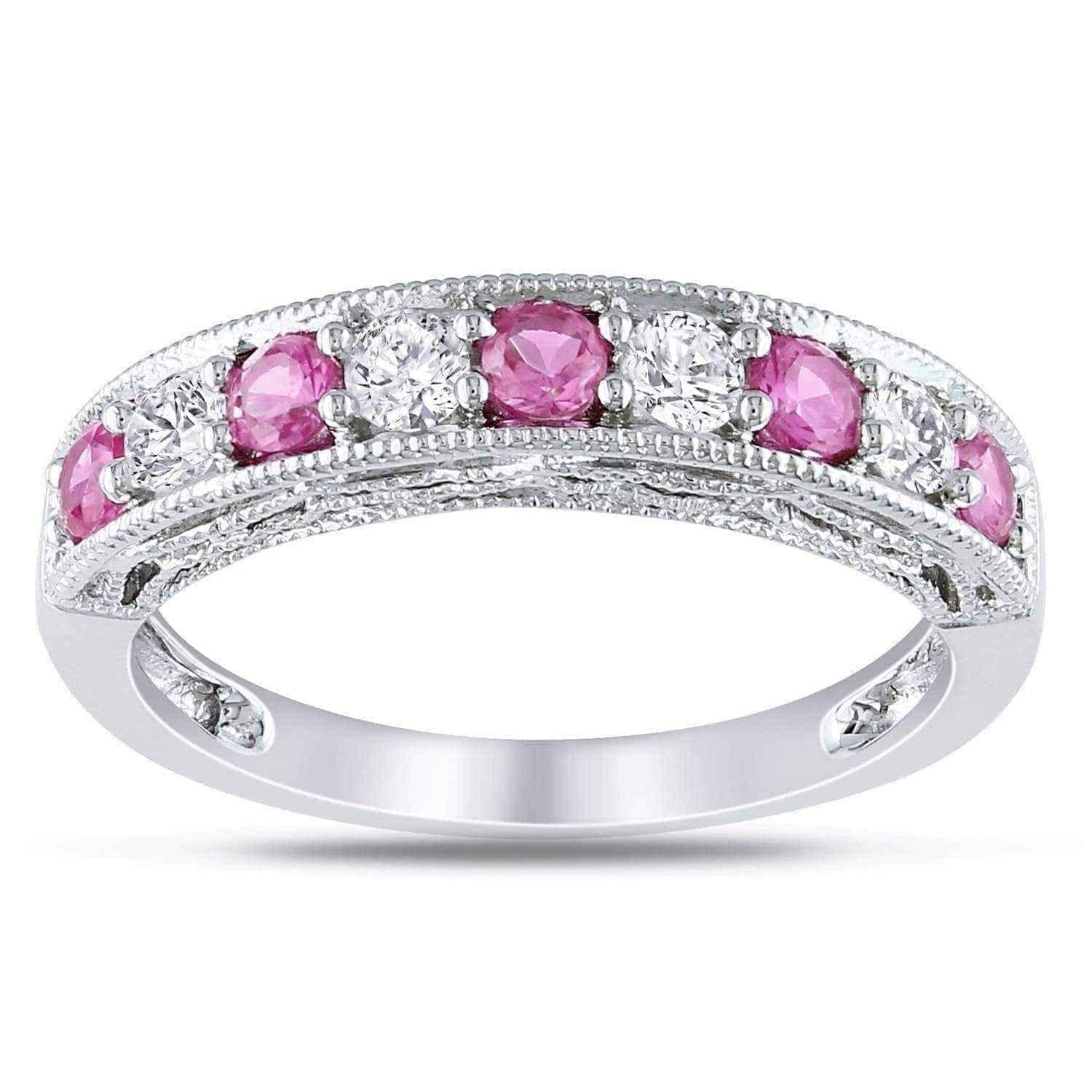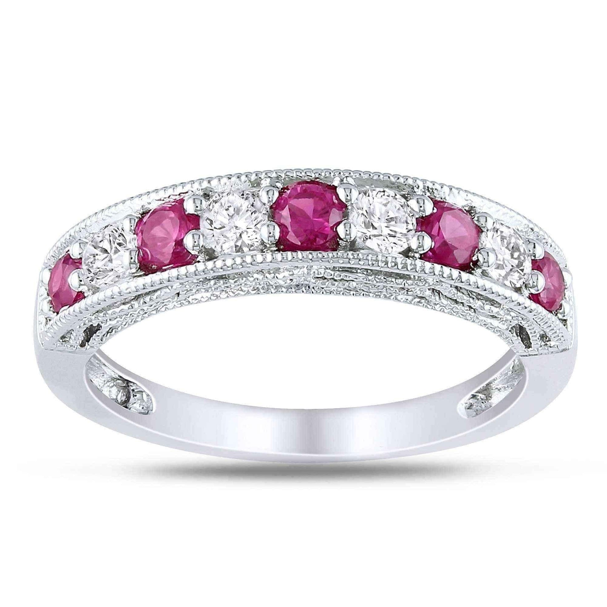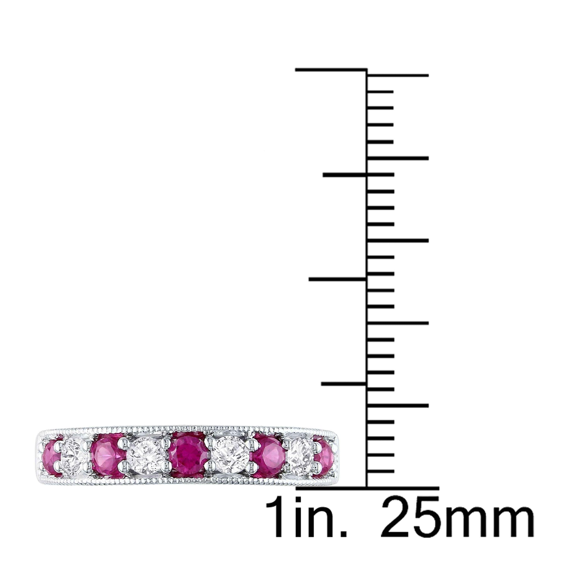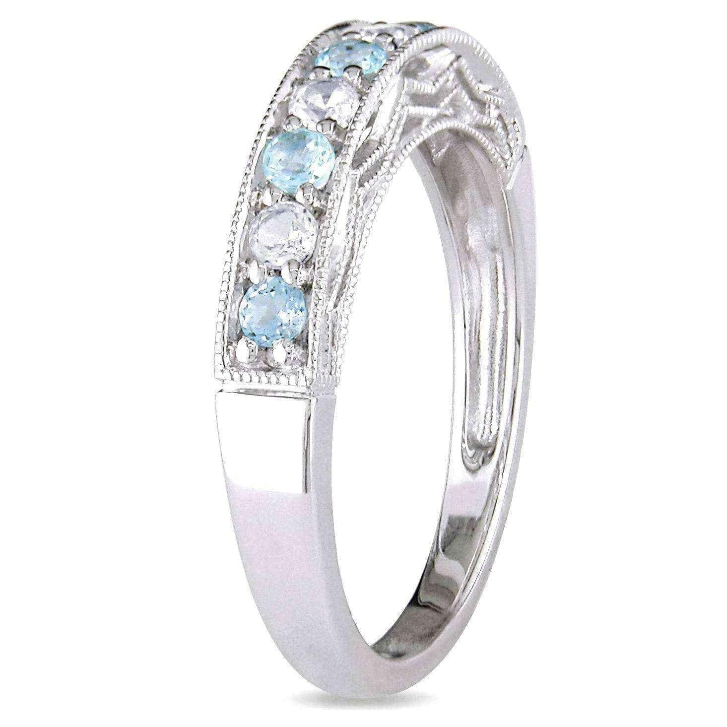 Showcase your style with the sparkling allure of this white sapphire and gemstone stackable anniversary band. Four round white sapphires are interspersed between your choice of brightly colored gemstones for a noticeable look. This band is slightly raised to show off stunning milgrain detailing along the edges and sides, giving the sterling silver a classic appeal.
