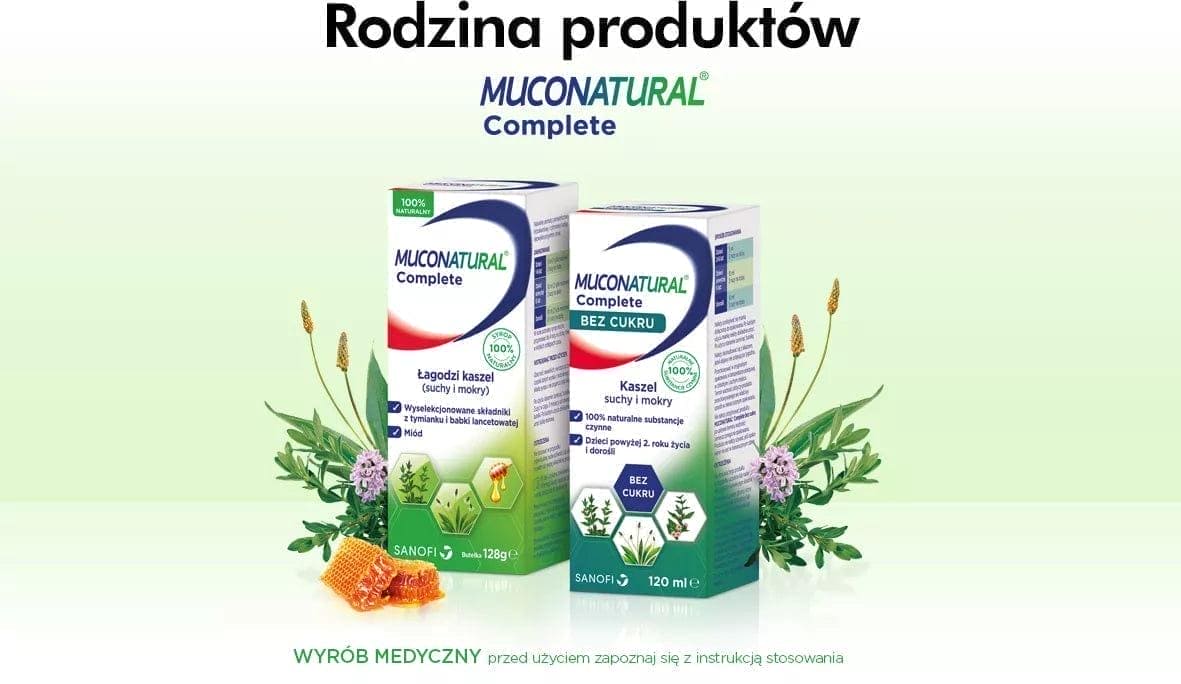 Medical device Muconatural Complete syrup designed for use in the treatment of dry and wet cough, recommended especially in the case of cough, which is associated with upper respiratory tract infections. Can be used over 1 year of age.