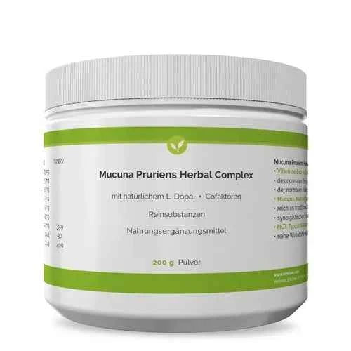The velvet bean (Mucuna pruriens), widespread in the tropics, contains natural L-Dopa, the direct precursor to the "happiness and motivation hormone" dopamine. In Mucuna Pruriens Herbal Complex, the valuable herbal ingredients of this special plant have been combined with other powerful synergists.