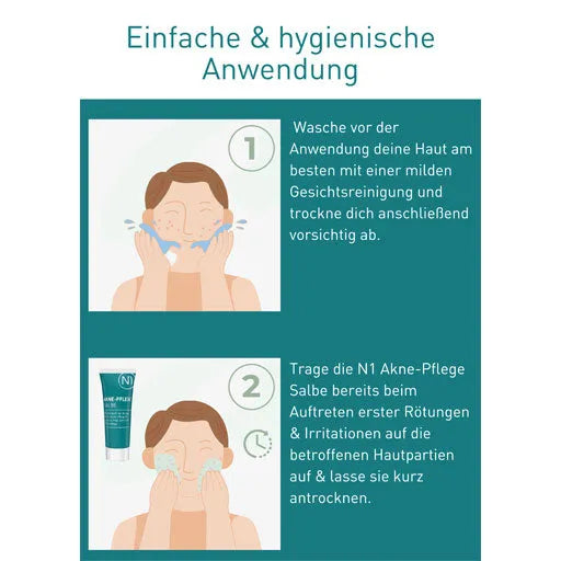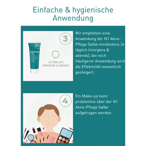 Before use, it is best to wash your skin with a mild facial cleanser and then dry it carefully. We recommend using the N1 acne ointment at least twice a day (morning and evening); if used more frequently, the effectiveness is significantly increased. Apply the N1 acne ointment to the affected areas of skin as soon as the first redness and irritation appears. Allow the ointment to dry briefly after application. Make-up can easily be applied over the N1 acne ointment.