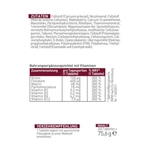 With the 240 tablets you support your body in maintaining all normal functions even in stressful everyday life, because the N1 VITAMIN B COMPLEX has a variety of important properties and contributes, among other things, to: