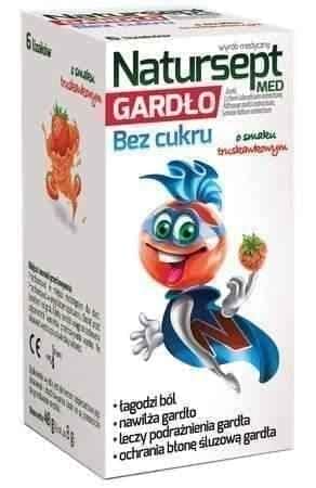 Strawberry sugar-free lollipops Natursept Med Throat is a medical device for use in children who experience pain, irritation and dry throat. The preparation contains a composition of plant extracts: sage, Icelandic lichen and marshmallow.